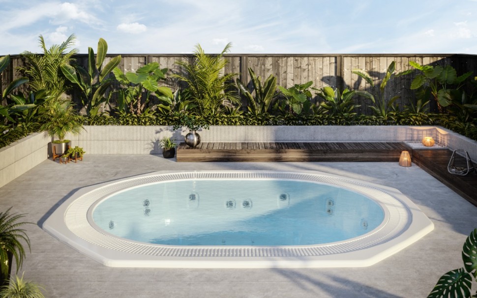 Отдыхайте с друзьями в прохладном бассейне в лучах солнца или проводите релакс-вечеринки на закате дня