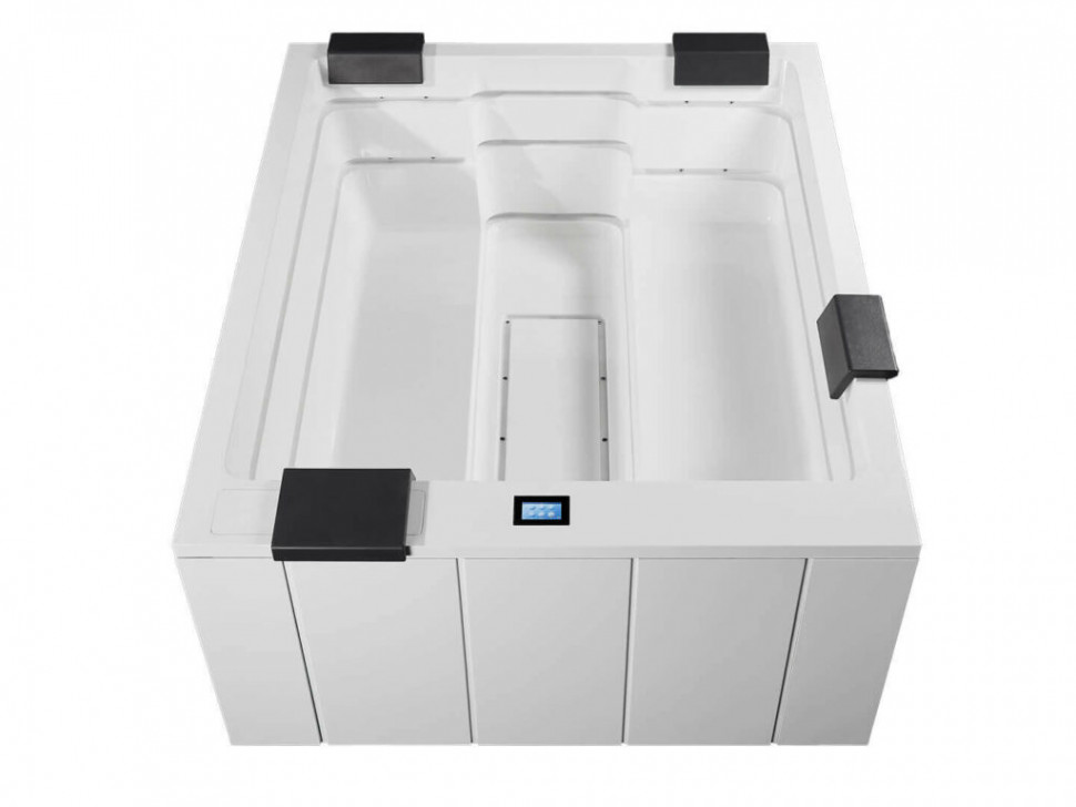 Интегрированный шезлонг с расположенными по длине форсунками обеспечивает последовательный массаж от плеч до голеней. Идеален для полной релаксации — вы лежите в комфортной позе, а система равномерно прорабатывает все мышцы корпуса и ног.